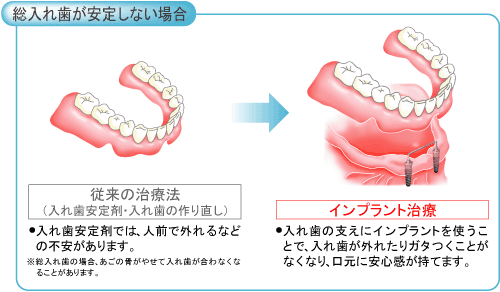 前歯を一本失った場合、奥歯を失った場合、全ての歯を失った場合、総入れ歯が安定しない場合など。